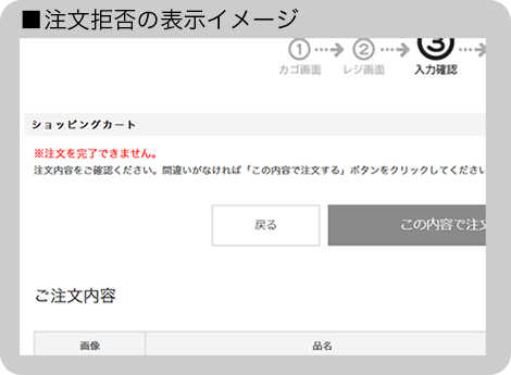 注文完了できない理由はあえて表示せず、ブラックリストによって拒否した事はわからないようにしています。